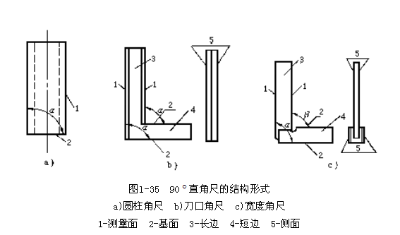 90°角尺按形式不同可分為圓柱角尺、刀口角尺和寬座角尺,見圖1-35。其中寬座角尺結(jié)構(gòu)簡(jiǎn)單,使用方便,主要測(cè)量工件的內(nèi)、外角。